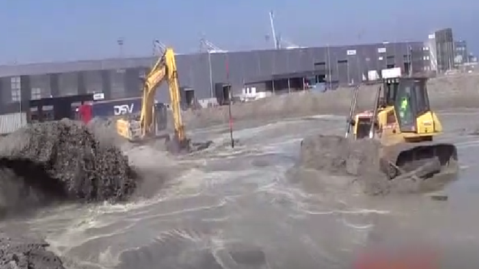 挖掘机和推土机在工地上作业,推土机明显是在玩水!