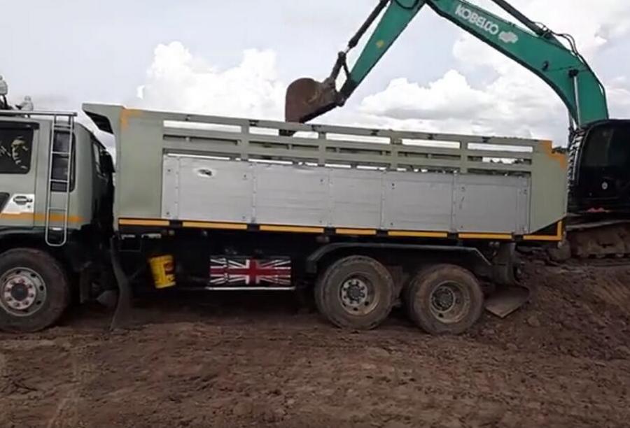 神钢sk200开挖新的池塘,自卸车的外饰真是夸张
