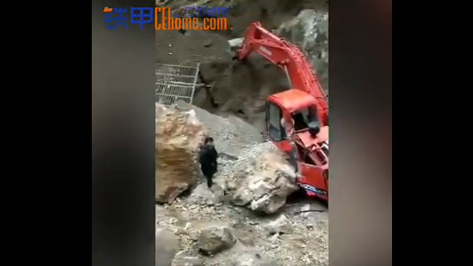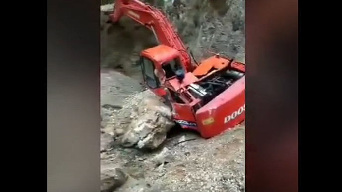 开挖机游全国的路上遇到山体滑坡带着继续前行
