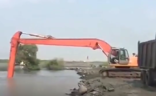挖掘机清理水塘淤泥,这机械臂可真长啊!