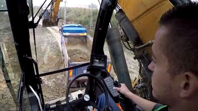 驾驶室实拍,司机是怎样驾驶轮式挖掘机干活的