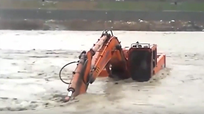 挖掘机陷入坑中,费了九牛二虎之力才救出