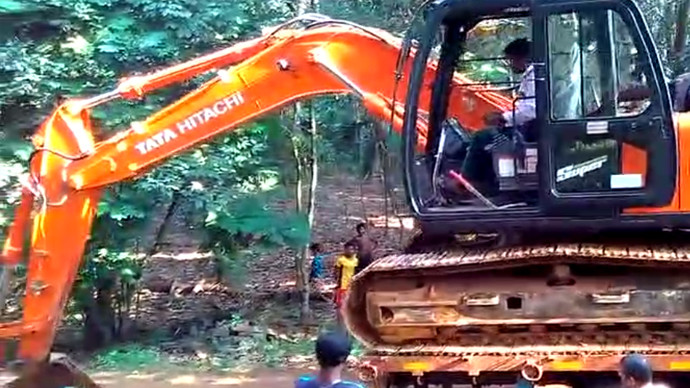印度司机开日立挖掘机下卡车,老外也学我们这样下车
