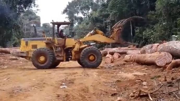 这一根圆木有多重?装载机为了搬运它,轮胎都翘起来了