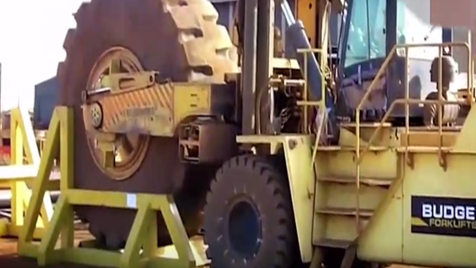 工地上的巨无霸更换轮胎 全程机械手臂完成!