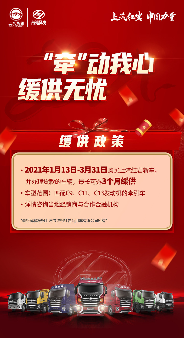 “牵”动我心,缓供无忧!买上汽红岩新车,最长可选3个月缓供