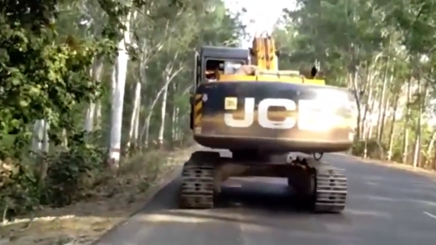JCB履带挖掘机行驶在水泥路上,这速度也挺快的!