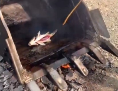 第一次看见用挖掘机煎鱼的,看起来还挺香,就是有点费油