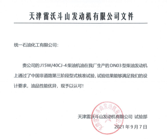 统一柴机油产品获雷沃斗山发动机认证推荐