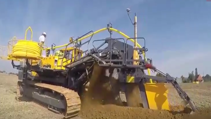 大型挖沟机作业,挖土跟切豆腐似的瞬间成沟