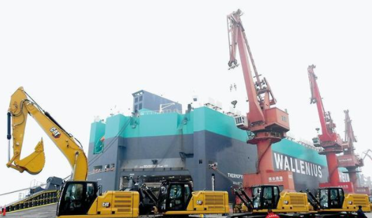 一批工程机械设备在江苏连云港港码头装船出口海外