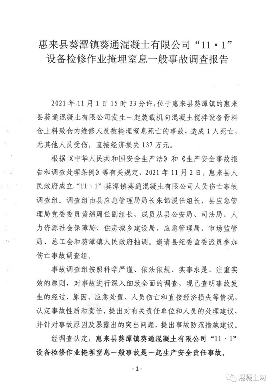 这家混凝土公司发生事故致1人死亡!调查报告发布