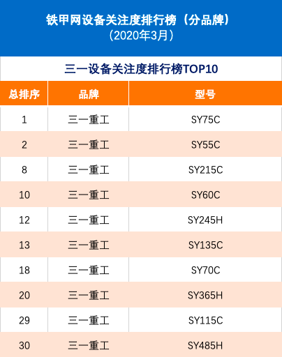 铁甲网设备关注度排行榜(分品牌-2020年3月)