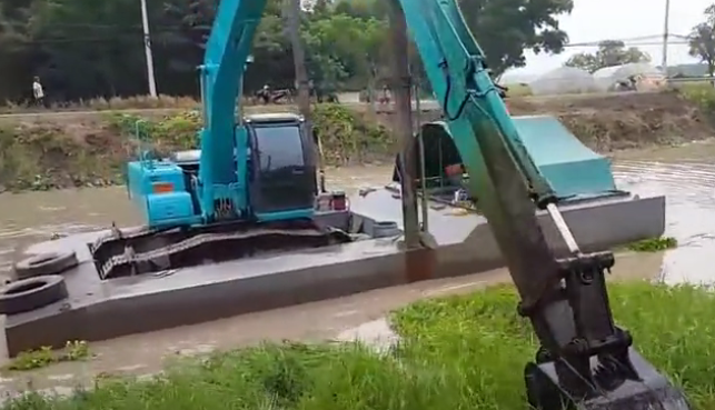 有意思,挖掘机站在船上干活,摇摇晃晃的,不知会不会晕船