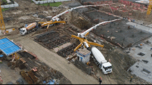 这个混凝土泵车厉害了,这个工地的混凝土需求都可满足!