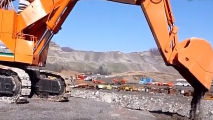 JCB挖掘机采石场装载碎石,挖机展示180度大旋转
