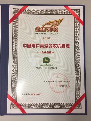 约翰迪尔荣获“金口碑奖” 备受用户喜爱