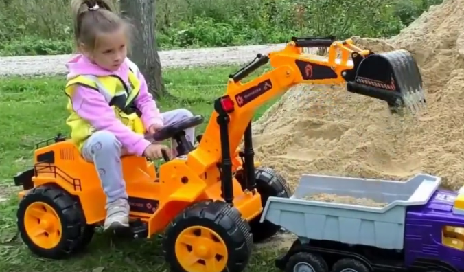 小萝莉玩挖掘机挖沙,巨大汽车翻斗车