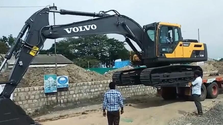 老板刚买的新沃尔沃挖掘机下板车,准备进行挖土装车!