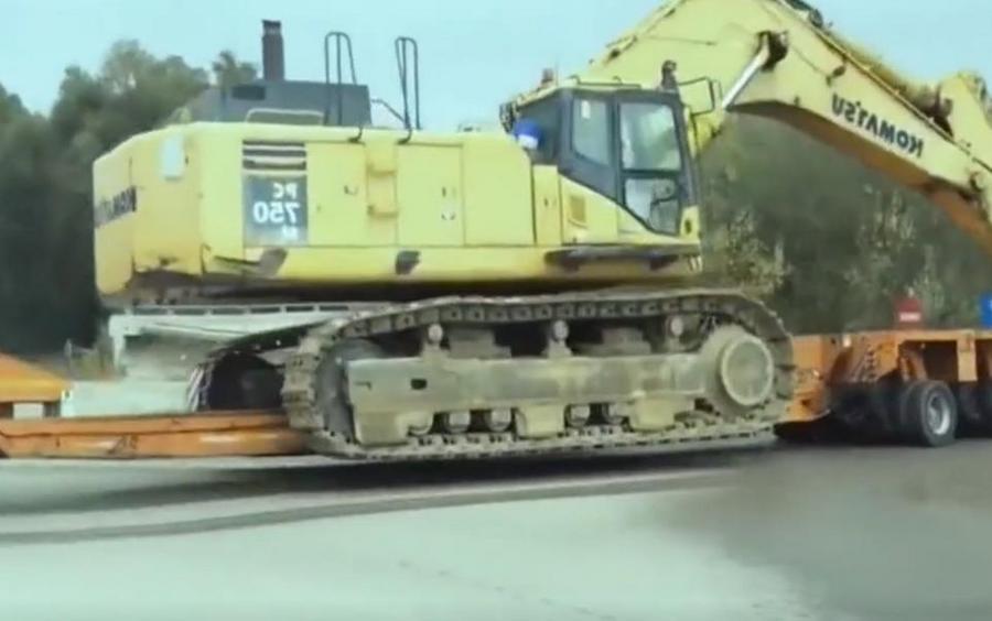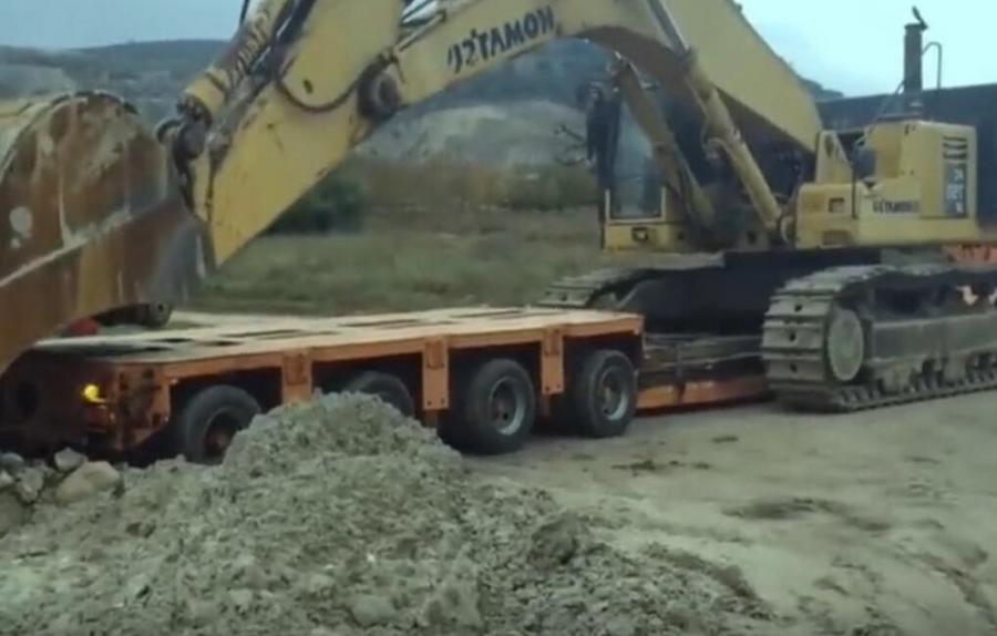 这司机会玩,一台拖车,同时拉两台挖掘机,拖车站的真稳