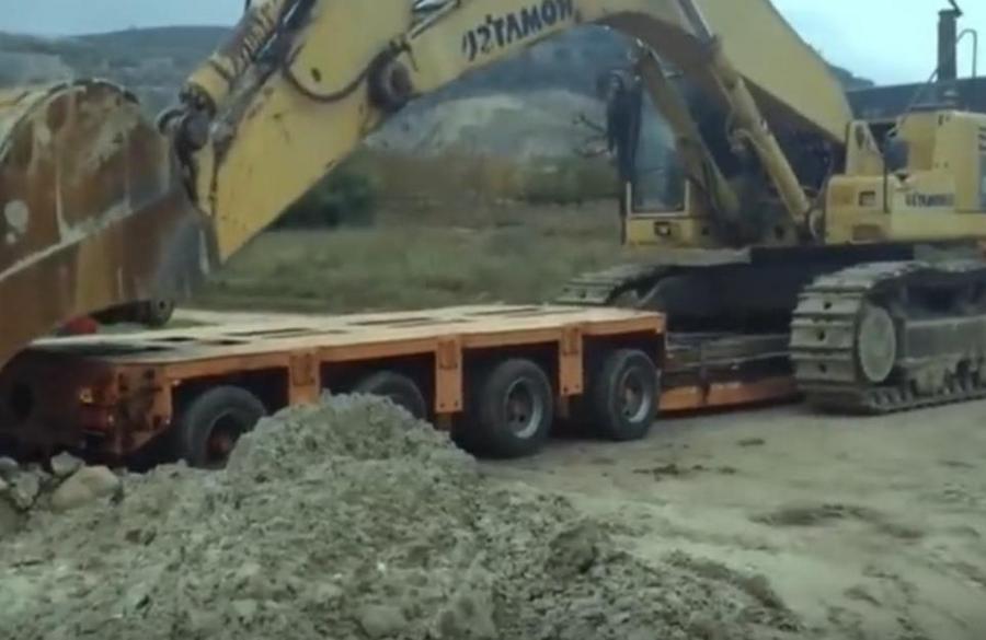 这司机会玩,一台拖车,同时拉两台挖掘机,拖车站的真稳