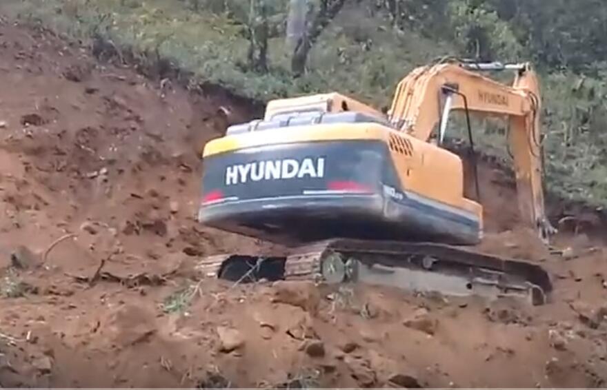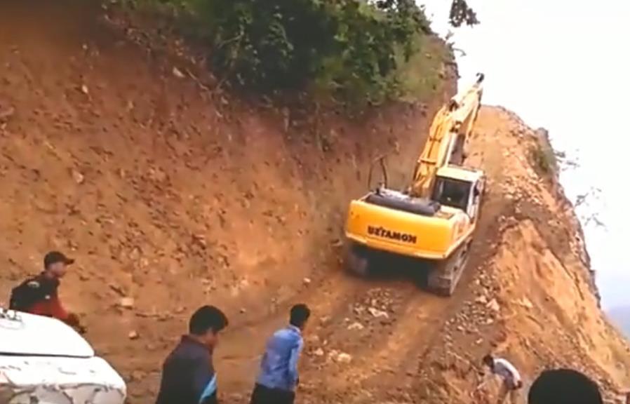 开挖机游全国的路上遇到山体滑坡带着继续前行