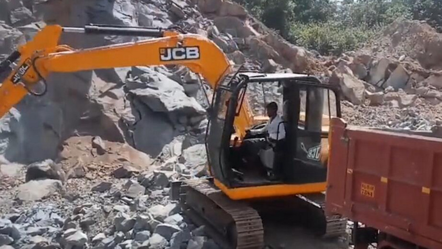 挖掘机挖掘碎石装载卡车,灰尘这么大也不关门!