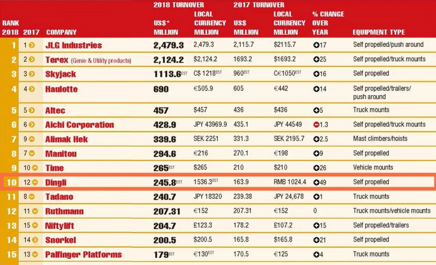 跻身10强!2018年全球高空作业平台制造商20强榜单(Access M20)发布!