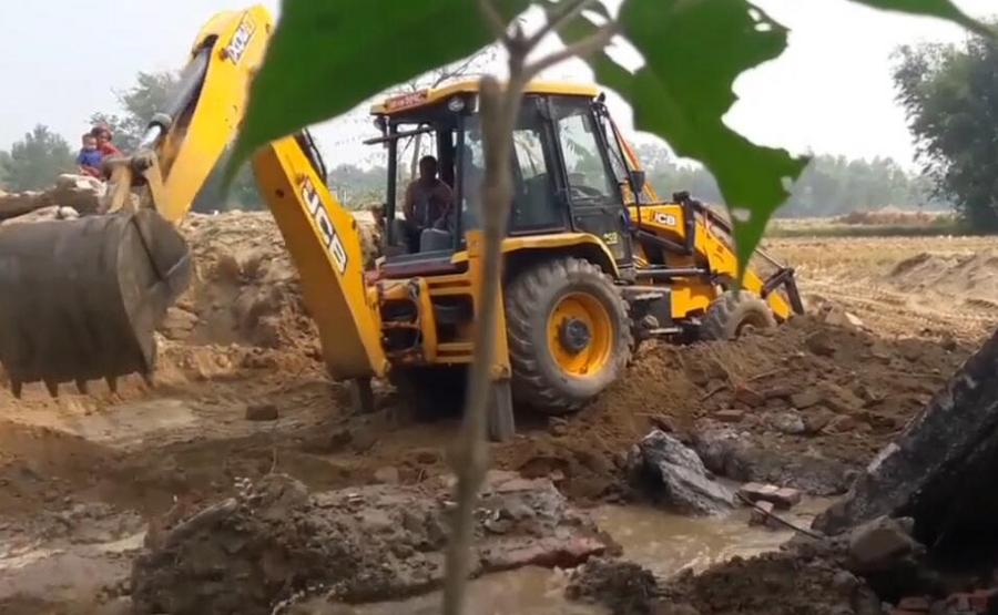 JCB反铲挖机开始清理河道,准备搭建桥梁