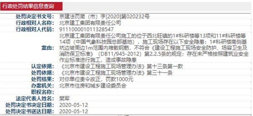 北京建工未严格按标准施工被北京住建处罚