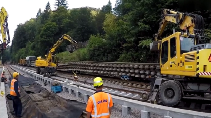 实拍铁路施工现场, 两台挖掘机移动铁轨