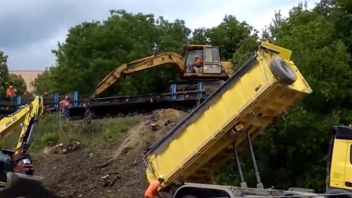 实拍利勃海尔和卡特挖掘机施工修路,奔驰卡车运料