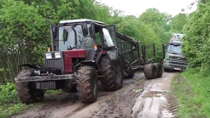 俄罗斯Mtz林业拖拉机,救援沃尔沃大卡车,这地面也太滑了吧!