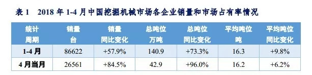 2018年1-4月中国挖掘机销量同比上涨58% 销量接近2011年历史极值