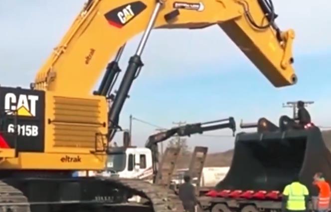 550吨日立挖掘机要出门,10几台叉车清理道路,垫几十块钢板